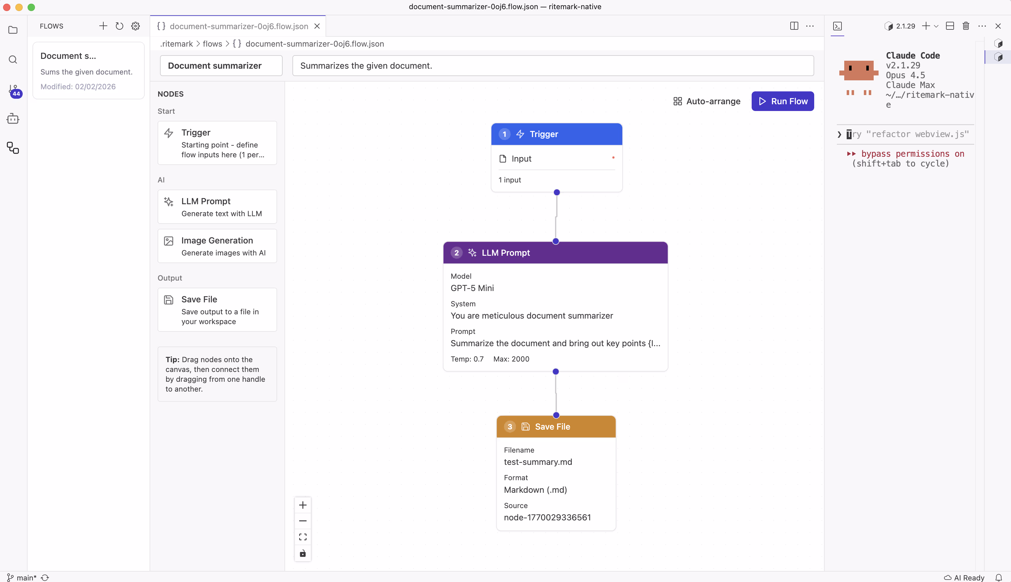 Ritemark v1.2.0 changes that. Flows lets you build visual workflows that run multiple AI tasks in sequence. Build once, run as often as you need.