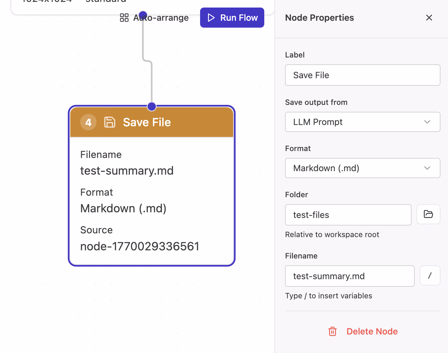 Click a node to open its settings in the right panel. Write prompts, select models, define output files.