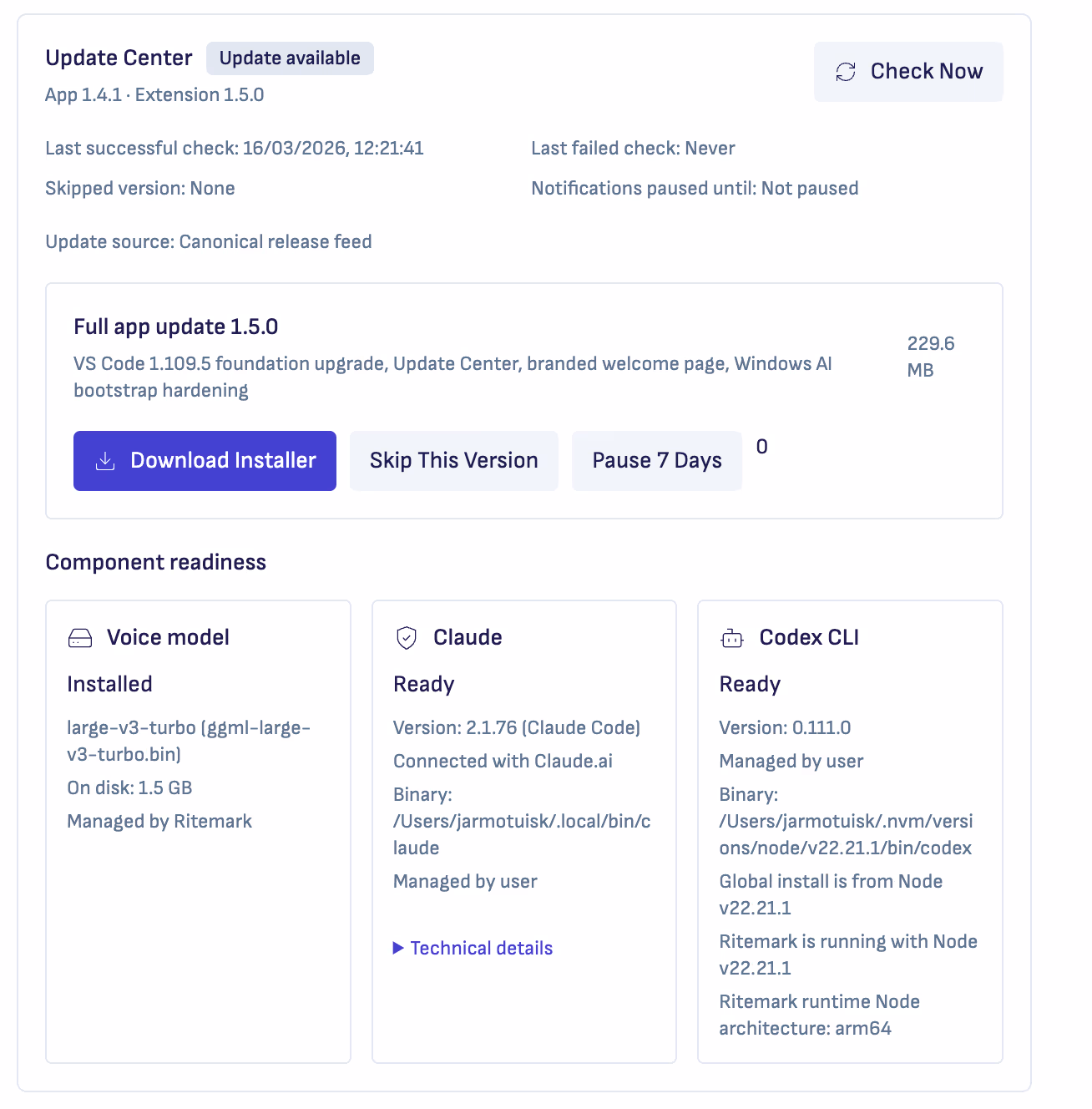 This matters because Ritemark isn't just one binary. It's a collection of components that work together: the editor, the AI agents, the voice model. The Update Center gives you a single place to see the health of all of them.