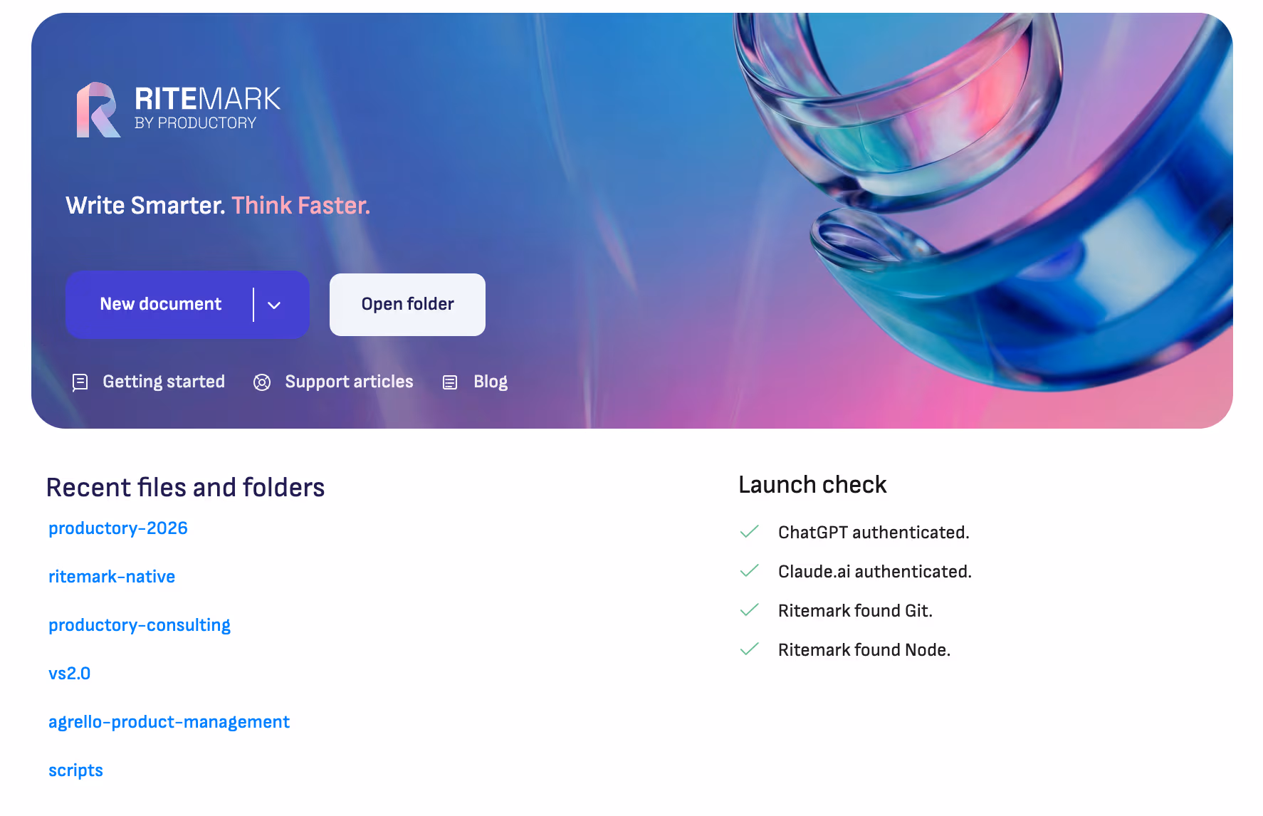 The first thing you see when you open Ritemark now looks different. The new Welcome Page leads with "Write Smarter. Think Faster." and immediately shows you what's ready and what's not.