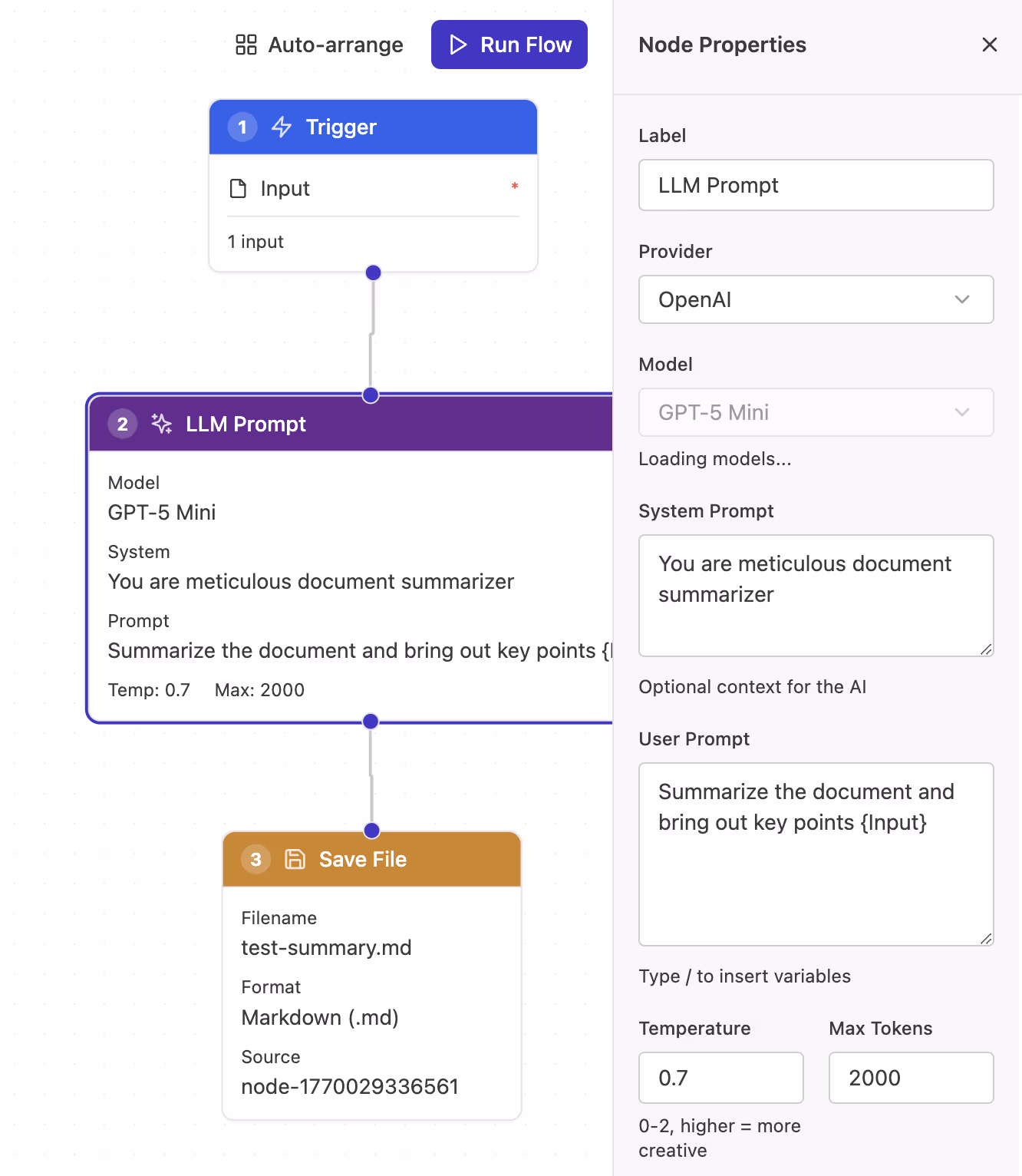 Kliki node-il selle seadete avamiseks parempoolsel paneelil. Kirjuta promptid, vali mudelid, määra väljundfailid.