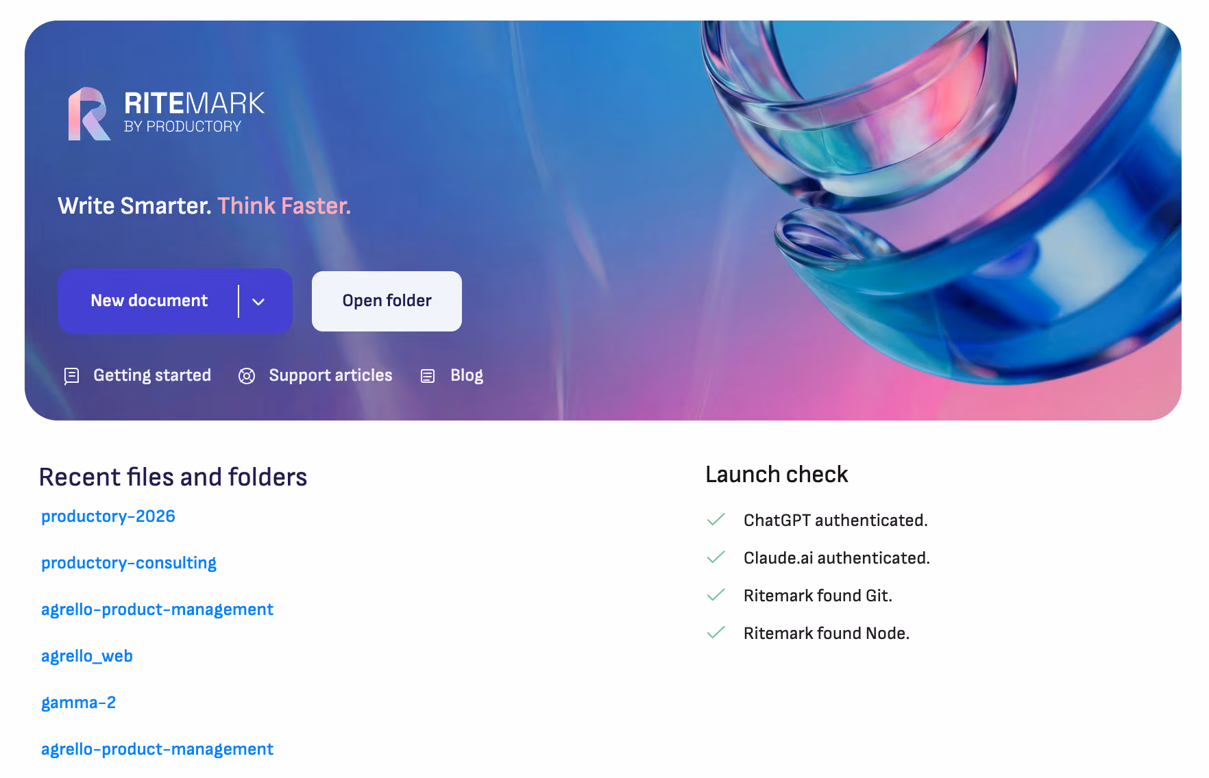 Esimene asi, mida Ritemarki avades näed, näeb nüüd teistsugune välja. Uus tervitusleht alustab sõnumiga "Write Smarter. Think Faster." ja näitab kohe, mis on valmis ja mis mitte.